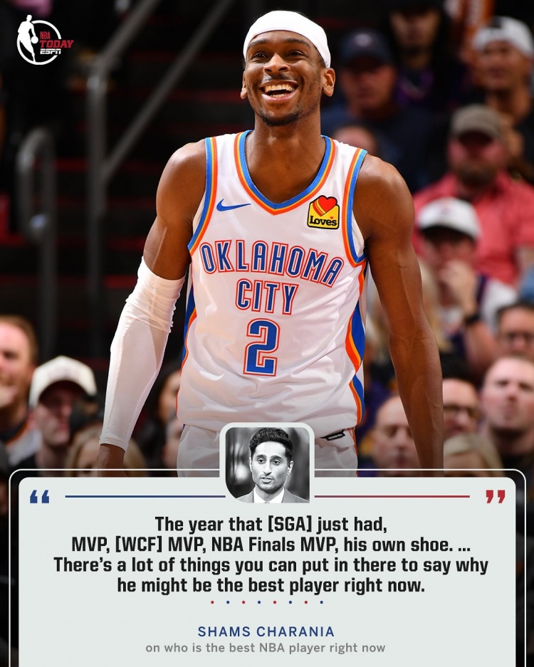 “这一年SGA集齐了总第一名 、最有价值球员、西决最有价值球员、总总决赛 最有价值球员,推出了自己的签名鞋,这所有的事情放在一起,你可以认为他现在也许是联盟的最佳球员了。”