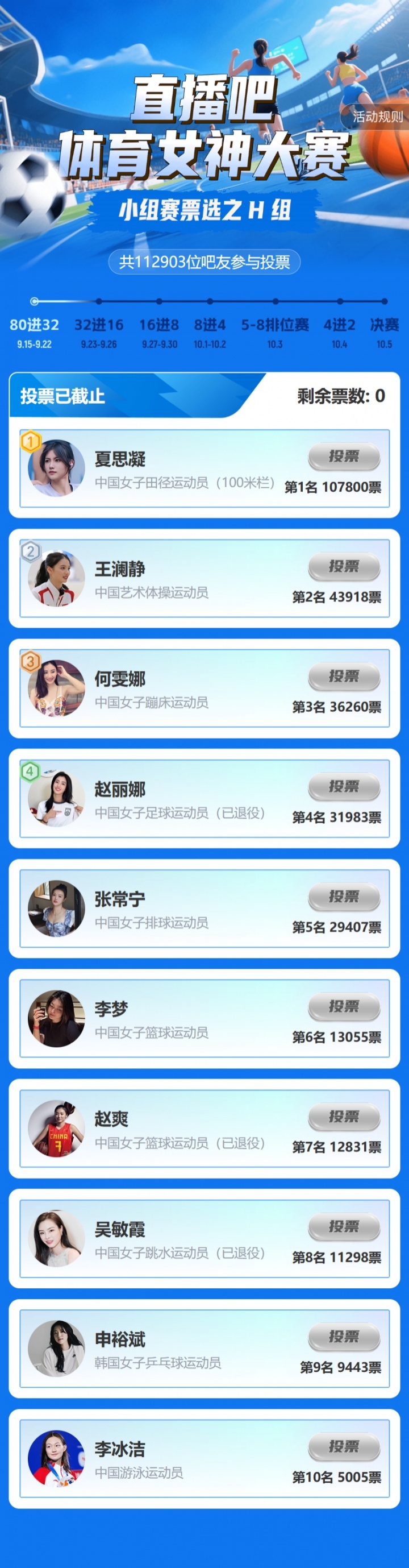 截至今日10:00,小组赛H组的投票已全部结束(👉点击查看H组赛果),晋级下一轮 32强的体育选手 分别是: