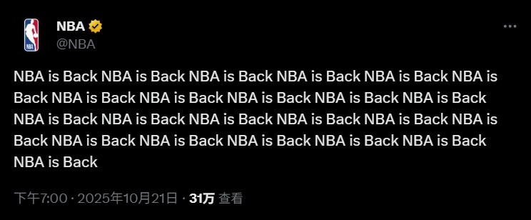 明日揭幕战打响!NBA官推预热:NBA就要回归啦啦啦啦啦啦啦
