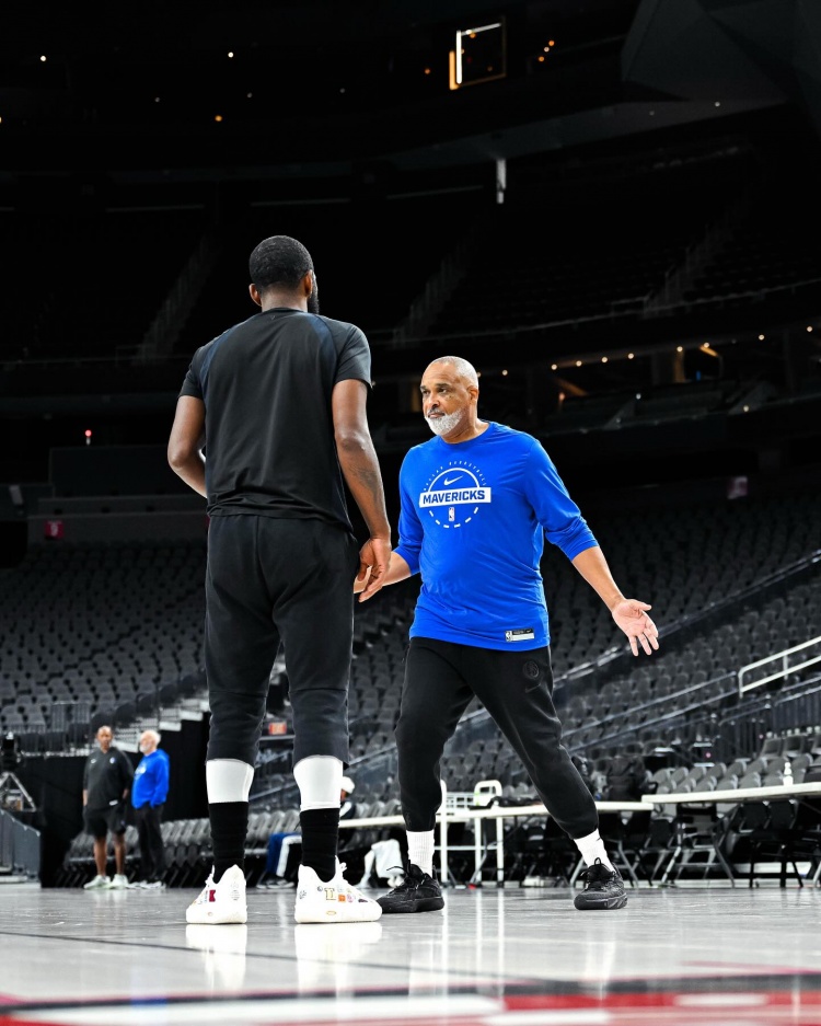 10月23日讯 独行侠助教菲尔-汉迪更新社媒,晒出了练习 时指导球员的照片。