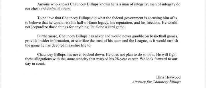 此外,昌西-比卢普斯从未也绝不会加入 篮球赛 赌博、泄露内幕信息,或背弃球队与联盟的信任——这都将玷污他奉献终身的体育事业。