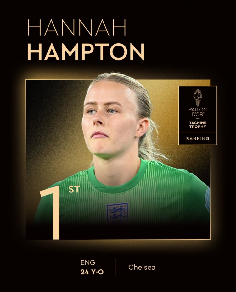 官方:切尔西、英格兰女足守门员汉娜-汉普顿获得2025年女足雅辛奖