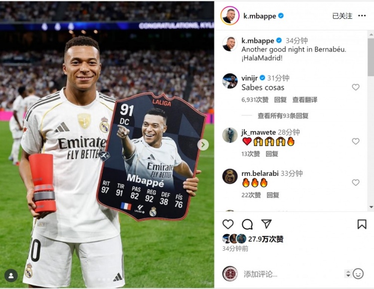 姆巴佩更新社媒动态,英超直播晒出赛前领取西甲9月最佳球员奖杯的照片,配文:“又一个美妙的伯纳乌之夜,Hala Madrid!”