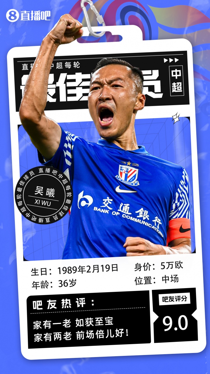 【】中超第26轮最佳球员评选结果出炉,上海申花领队 吴曦当选!36岁的吴曦连进两球,率领申花主场作战 6-1击败梅州客家,保持对中超第一名 的冲击,这是吴曦本赛季第二次赢得中超最佳评选!
