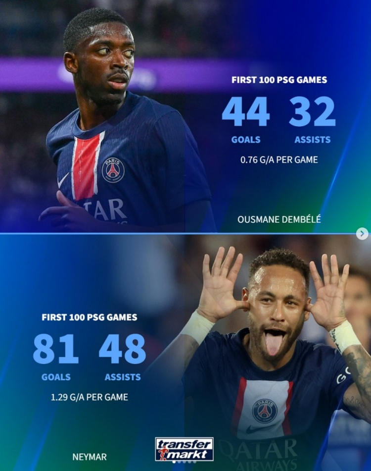 10月22日讯 在本轮欧冠巴黎7-2击败勒沃库森的赛事 中,登贝莱迎来巴黎生涯100场里程碑,德转也对比了登贝莱与内马尔、伊布、姆巴佩等人在巴黎前100场加入 得分 数据: