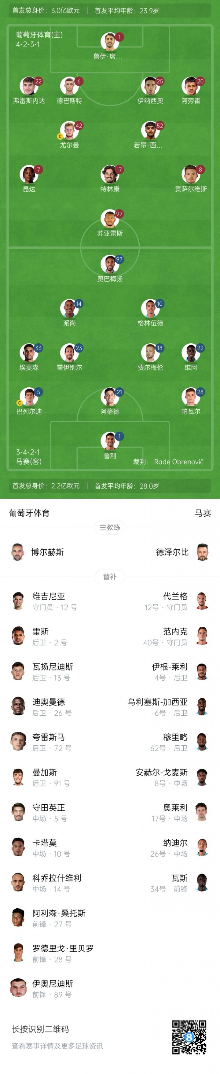 葡萄牙体育后备 :12-维吉尼亚、2-雷斯、26-迪奥曼德、72-夸雷斯马、91-曼加斯、5-守田英正、10-卡塔莫、14-科乔拉什维利、27-阿利森·桑托斯、28-罗德里格·里贝罗、89-伊奥尼迪斯