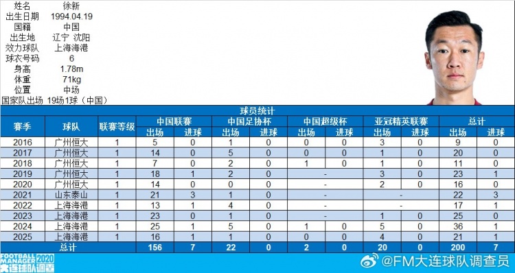 徐新曾效力于广州队、山东泰山队,英超免费高清直播目前效力于上海海港队。此外,徐新共代表国足出战19场,贡献了1个得分 。