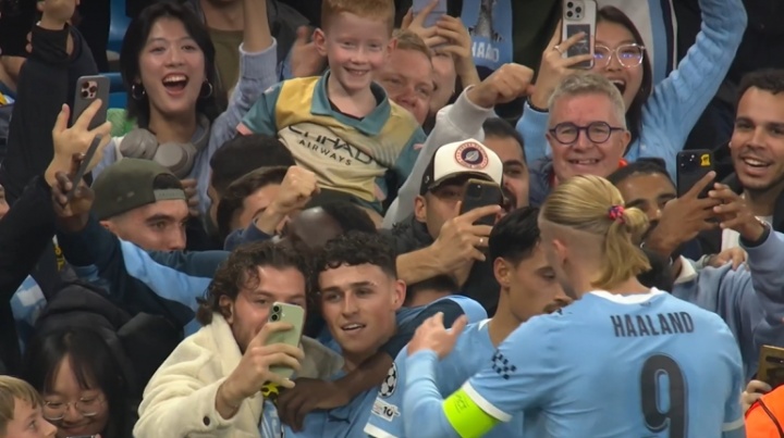 11月06日讯 欧冠职业联赛 阶段第4轮曼城vs多特第22分钟,福登得分 后跑到角旗区庆祝,英超直播有球迷搂着他自拍了一张,福登还看镜头笑的特别协作 。